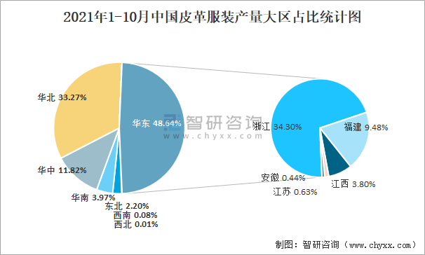 2021年1-10月中國皮革服裝產(chǎn)量大區(qū)占比統(tǒng)計圖