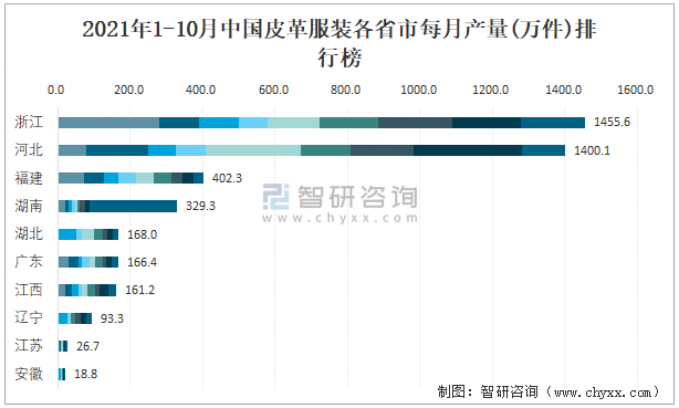 2021年1-10月中國皮革服裝各省市每月產(chǎn)量排行榜