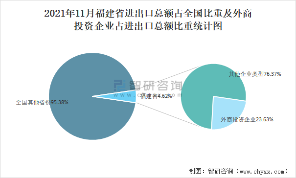 2021年11月福建省進(jìn)出口總額占全國(guó)比重及外商投資企業(yè)占進(jìn)出口總額比重統(tǒng)計(jì)圖