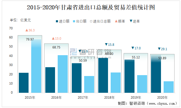 2015-2020年甘肅省進出口總額及貿易差值統計圖