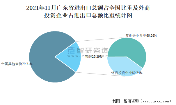 2021年11月廣東省進出口總額占全國比重及外商投資企業占進出口總額比重統計圖