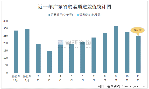 近一年廣東省進出口每月均呈現貿易順差狀態,其差值在2021年9月達到最大值,此后逐月遞減,2021年11月廣東省進出口貿易差值為246.32億美元。2021年11月廣東省進出口總額占全國比重為20.29%,相較于其他類型的企業,其中廣東省外商投資企業進出口總額占進出口總額比重為39.74%。