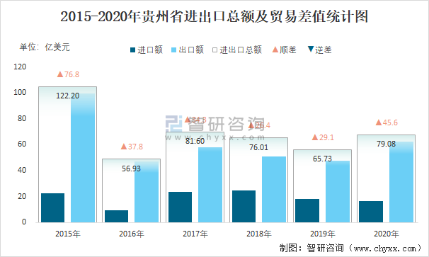2015-2020年貴州省進出口總額及貿易差值統計圖