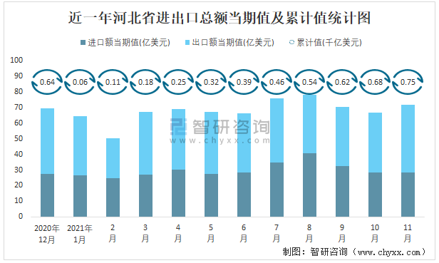 近一年河北省進(jìn)出口總額當(dāng)期值及累計(jì)值統(tǒng)計(jì)圖