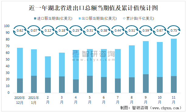 近一年湖北省進出口總額當期值及累計值統計圖