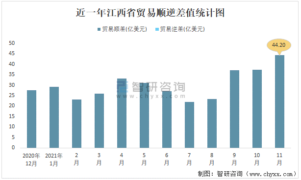 近一年江西省貿易順逆差值統計圖