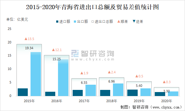 2015-2020年青海省進出口總額及貿易差值統計圖