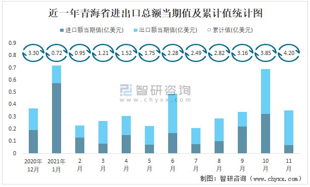 2021年1-11月青海省進出口總額為4.2億美元,累計同比增長43.1%