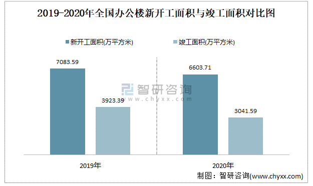 2019-2020年全國辦公樓新開工面積與竣工面積對比圖