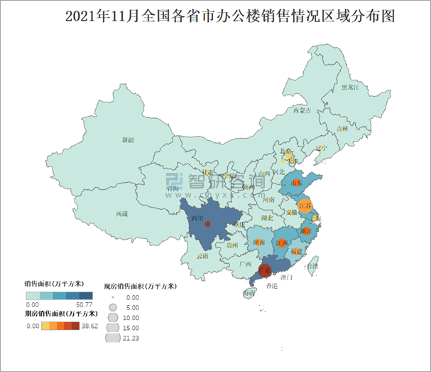 2021年11月全國各省市辦公樓銷售情況區域分布圖