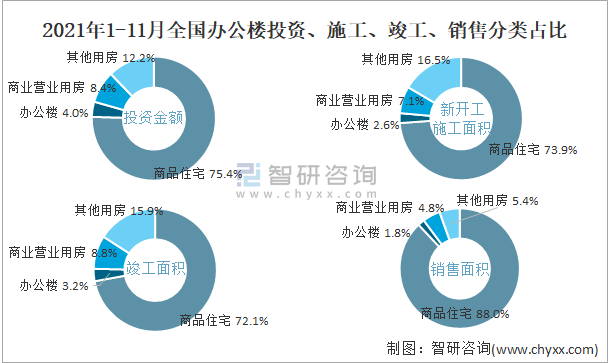 根據國家統計局數據統計可知:2021年1-11月全國房地產開發企業在辦公樓中投資金額占比為4%,辦公樓的新開工面積與竣工面積所占比重差異不大,從銷售面積來看,辦公樓銷售面積占比少于商業營業用房銷售面積占比。