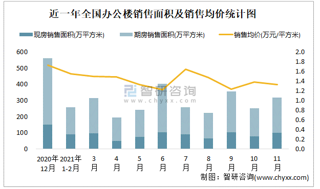 近一年全國辦公樓銷售面積及銷售均價統計圖