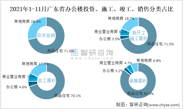 2021年1-11月廣東省辦公樓投資、施工、竣工、銷售分類占比