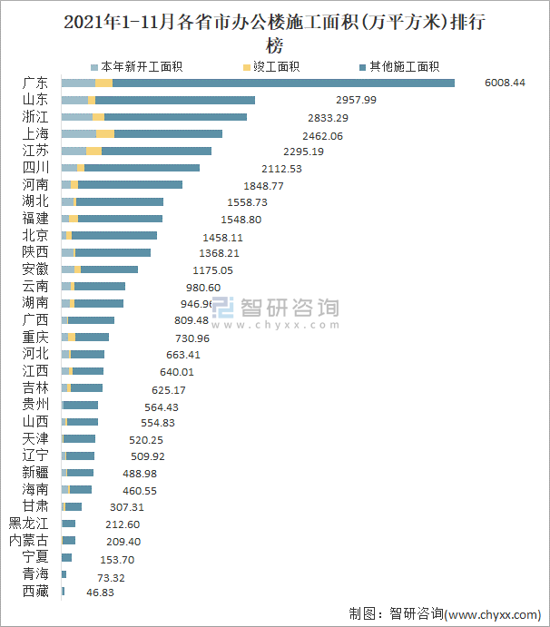 2021年1-11月各省市辦公樓施工面積(萬(wàn)平方米)排行榜