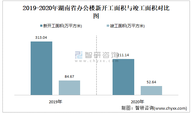 2019-2020年湖南省辦公樓新開工面積與竣工面積對比圖