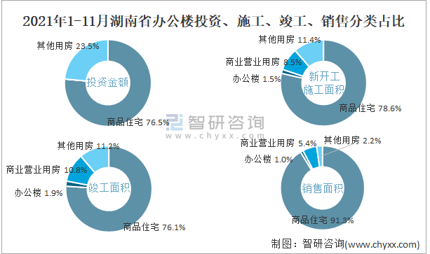 根據國家統計局數據統計可知:2021年1-11月湖南省房地產開發企業在包括辦公樓在內的其他用房投資金額占比為23.5%(注:只有投資金額中其他用房包含辦公樓、商業營業用房),辦公樓的新開工面積與竣工面積所占比重差異不大,從銷售面積來看,辦公樓銷售面積占比少于商業營業用房銷售面積占比。