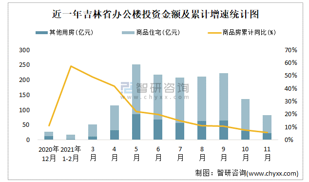 根據國家統計局數據統計可知:2021年11月吉林省房地產開發投資商品房投資金額為83.44億元,其中包括辦公樓、商業營業用房等其他用房22.96億元(注:辦公樓、商業營業用房未分開統計);2021年1-11月吉林省房地產開發投資包括辦公樓在內的其他用房累計金額為440.13億元。