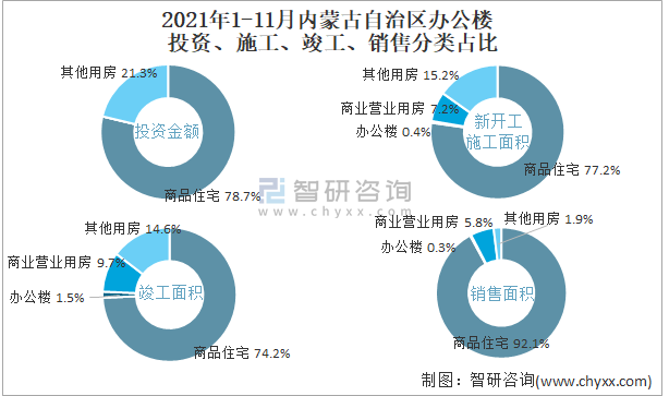 根據國家統計局數據統計可知:2021年1-11月內蒙古自治區房地產開發企業在包括辦公樓在內的其他用房投資金額占比為21.3%(注:只有投資金額中其他用房包含辦公樓、商業營業用房),辦公樓的新開工面積與竣工面積所占比重差異不大,從銷售面積來看,辦公樓銷售面積占比少于商業營業用房銷售面積占比。