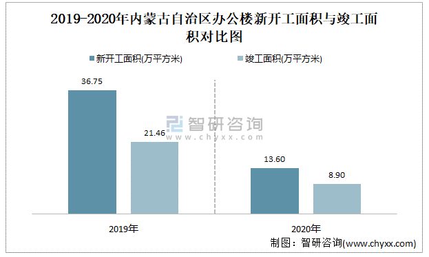 2019-2020年內蒙古自治區辦公樓新開工面積與竣工面積對比圖
