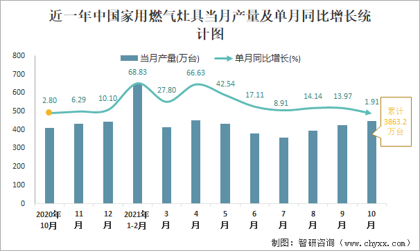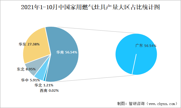 2021年1-10月中國家用燃氣灶具產量為3863.2萬臺 華南地區產量最高(占比56.54%)