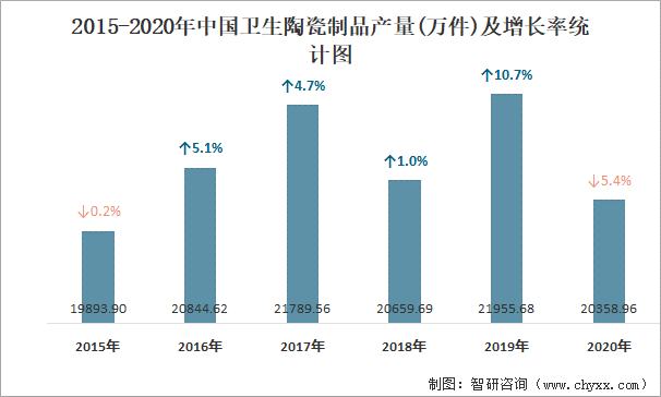 2015-2020年中國衛(wèi)生陶瓷制品產(chǎn)量及增長(zhǎng)率統(tǒng)計(jì)圖