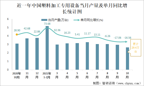 近一年中國塑料加工專用設備當月產量及單月同比增長統計圖