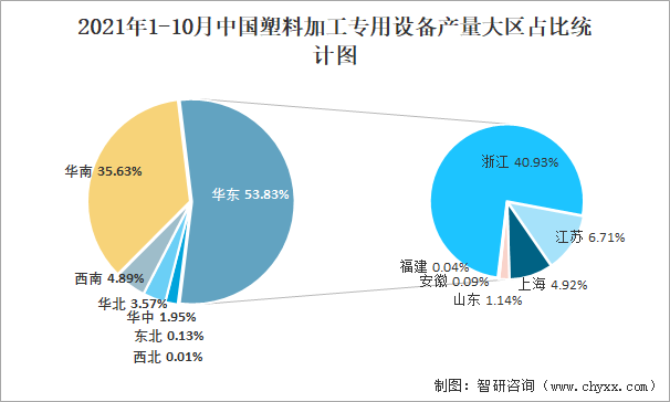 2021年1-10月中國塑料加工專用設備產量大區占比統計圖