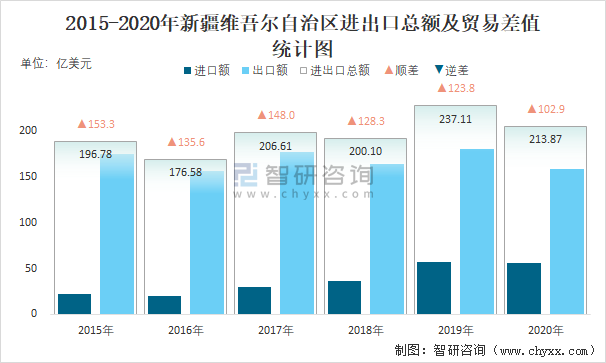 2015-2020年新疆維吾爾自治區(qū)進出口總額及貿(mào)易差值統(tǒng)計圖