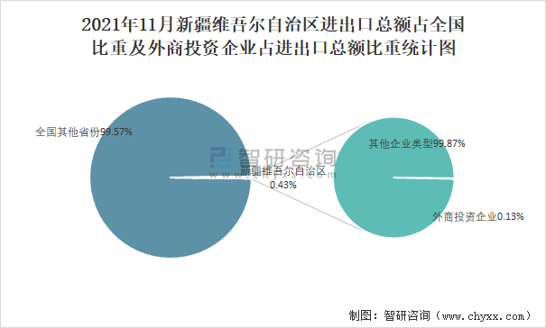 2021年11月新疆維吾爾自治區(qū)進出口總額占全國比重及外商投資企業(yè)占進出口總額比重統(tǒng)計圖