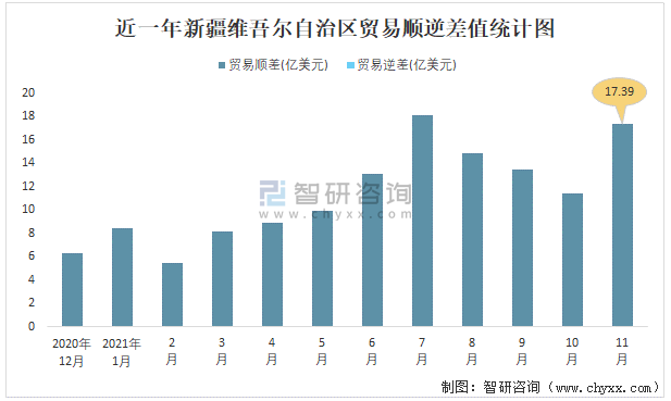 近一年新疆維吾爾自治區(qū)貿(mào)易順逆差值統(tǒng)計圖