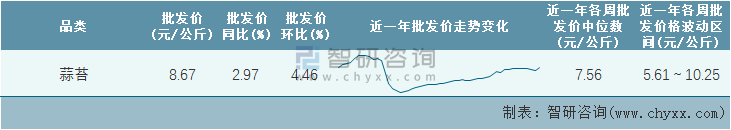 根據(jù)農(nóng)村農(nóng)業(yè)部數(shù)據(jù)統(tǒng)計(jì)可知:2022年第1周全國蒜苔平均批發(fā)價(jià)為8.67元/公斤,同比增加2.97%,環(huán)比增加4.46%,近一年蒜苔價(jià)格2021年上半年探底后,總體呈現(xiàn)上升趨勢,近一年全國蒜苔平均批發(fā)價(jià)最高達(dá)到10.25元/公斤,批發(fā)價(jià)最低也要5.61元/公斤。