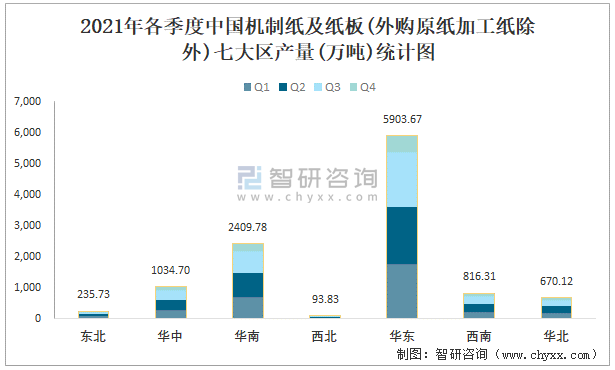 2021年各季度中國(guó)機(jī)制紙及紙板(外購(gòu)原紙加工紙除外)七大區(qū)產(chǎn)量統(tǒng)計(jì)圖