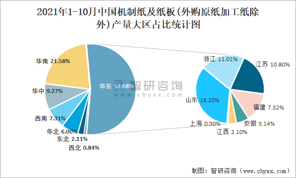 2021年1-10月中國(guó)機(jī)制紙及紙板(外購(gòu)原紙加工紙除外)產(chǎn)量大區(qū)占比統(tǒng)計(jì)圖