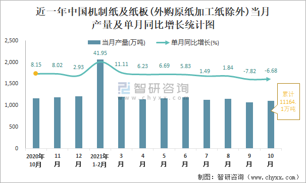 近一年中國(guó)機(jī)制紙及紙板(外購(gòu)原紙加工紙除外)當(dāng)月產(chǎn)量及單月同比增長(zhǎng)統(tǒng)計(jì)圖