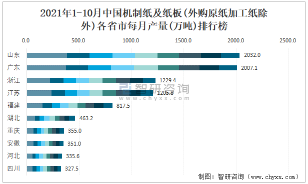 2021年1-10月中國(guó)機(jī)制紙及紙板(外購(gòu)原紙加工紙除外)各省市每月產(chǎn)量排行榜