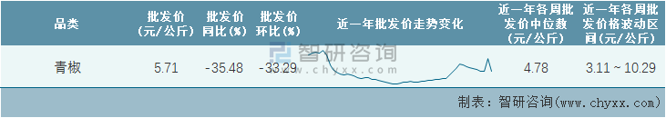 根據(jù)農(nóng)村農(nóng)業(yè)部數(shù)據(jù)統(tǒng)計(jì)可知:2022年第1周全國(guó)青椒平均批發(fā)價(jià)為5.71元/公斤,同比下跌35.48%,環(huán)比下跌33.29%,近一年全國(guó)青椒平均批發(fā)價(jià)最高達(dá)到10.29元/公斤,批發(fā)價(jià)最低也要3.11元/公斤。