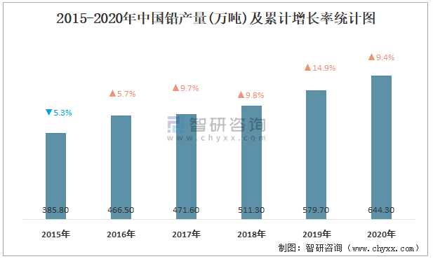 根據國家統計局數據顯示:2021年11月中國鉛產量為67.3萬噸,同比增長7.9%;2021年1-11月中國鉛累計產量為662.4萬噸,累計增長12.4%;2015-2020年中國鉛產量逐年遞增,在2020年達到最高。