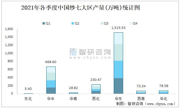 根據國家統計局數據顯示:2021年各季度中國紗主要集中在華東、華中、西北地區生產;2021年1-11月中國紗產量大區分布不均衡,其中華東地區產量最高,特別是福建省貢獻了最多產量;2021年1-11月中國紗各省市產量top1領先于其他前9名。