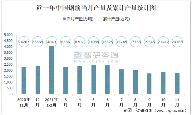 根據國家統計局數據顯示:2021年11月中國鋼筋產量為1777萬噸,同比下降23.7%;2021年1-11月中國鋼筋累計產量為23184.7萬噸,累計下降4.1%;2015-2020年中國鋼筋產量自2017年起開始逐年遞增。
