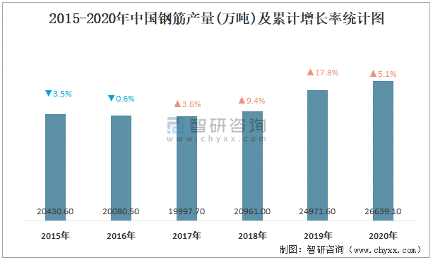 2015-2020年中國鋼筋產量及累計增長率統計圖