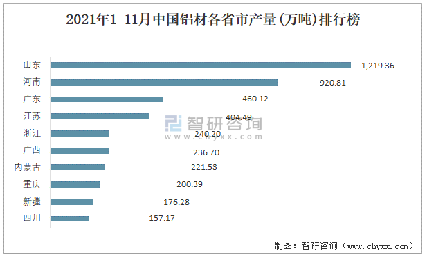 2021年1-11月中國鋁材各省市產(chǎn)量排行榜