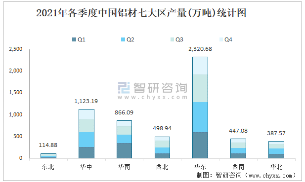 2021年各季度中國鋁材七大區(qū)產(chǎn)量統(tǒng)計圖