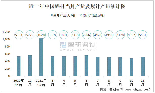 近一年中國鋁材當月產(chǎn)量及累計產(chǎn)量統(tǒng)計圖