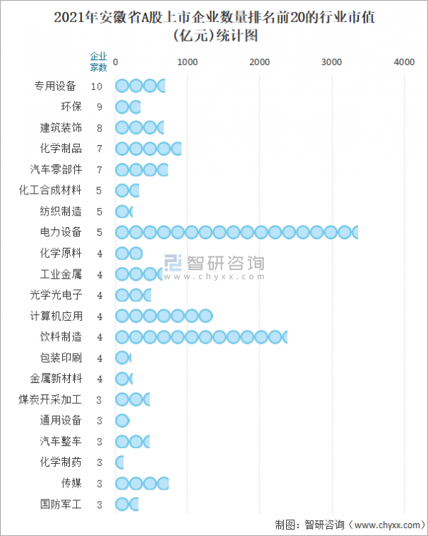 2021年安徽省A股上市企業數量排名前20的行業市值(億元)統計圖
