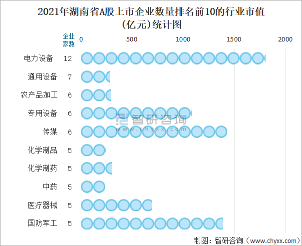 2021年湖南省A股上市企業(yè)數(shù)量排名前10的行業(yè)市值(億元)統(tǒng)計(jì)圖