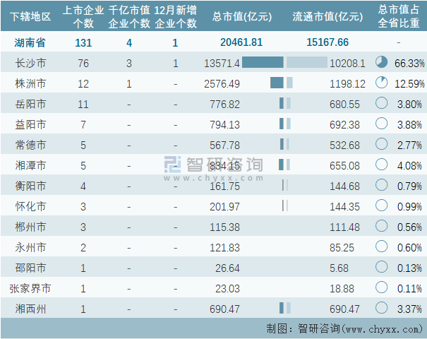 據(jù)同花順統(tǒng)計(jì)數(shù)據(jù)可知:截止至2021年12月31日,湖南省的A股上市企業(yè)共計(jì)131家,上市企業(yè)數(shù)量排名全國(guó)第10,總市值共計(jì)20461.81億元,其中達(dá)嘉維康1家企業(yè)為12月新在A股上市的企業(yè);除婁底市1個(gè)地級(jí)行政區(qū)以外,湖南省其他13個(gè)地級(jí)行政區(qū)均有企業(yè)在A股上市,其中長(zhǎng)沙市上市企業(yè)數(shù)量最多,為76家;湖南省的A股上市千億市值企業(yè)數(shù)量在全國(guó)排名第8,共計(jì)4家,分布在長(zhǎng)沙市、株洲市2個(gè)地區(qū),其中長(zhǎng)沙市千億市值企業(yè)最多,為3家;長(zhǎng)沙市A股上市企業(yè)總市值總流通市值均為最高。