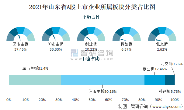 2021年山東省A股上市企業所屬板塊分類占比圖