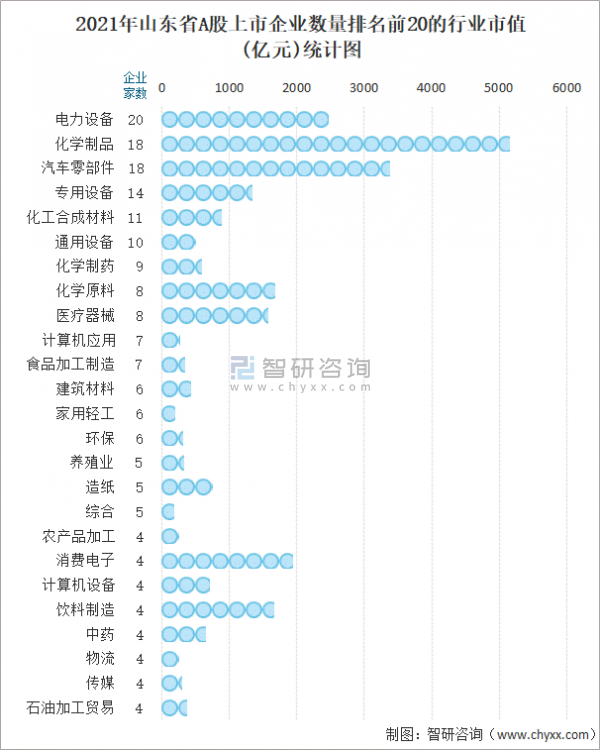 據同花順統計數據可知:山東省的A股上市企業涵蓋62個行業,其中從事電力設備行業的企業最多,有20家,占全省A股上市企業數量比重為7.49%;化學制品行業的總市值最高,其總市值為5153.33億元,占全省A股上市企業總市值比重為12.18%。