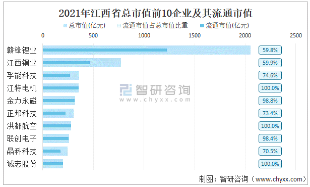 2021年江西省A股上市總市值前10強企業及其流通市值