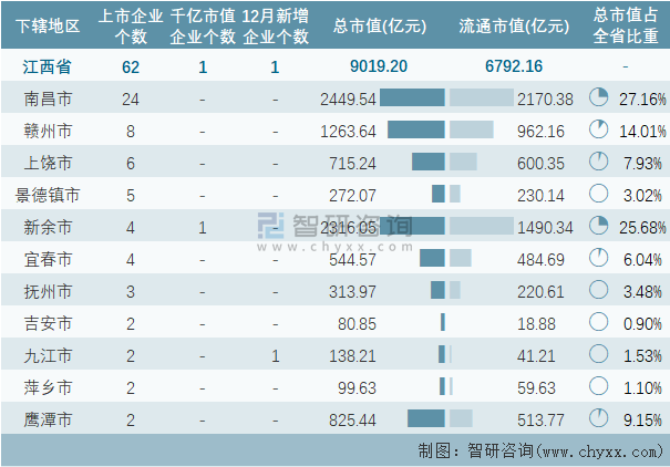 2021年江西省62家A股上市企業總市值9019.2億元,化學制品行業上市企業最多